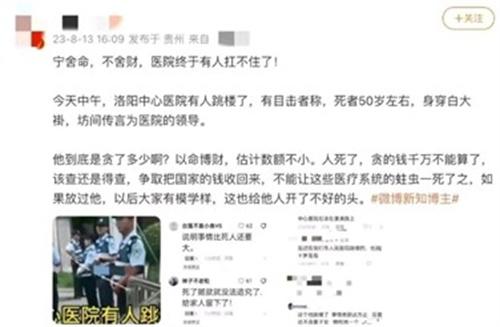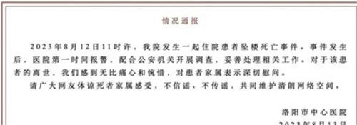 2023年8月12日,洛陽市中心醫院有一名患者墜樓的事件,在網絡上引起廣泛的關注,醫院在第一時間報警,配合警方展開了相關調查。妥善處理以上的事宜,對于患者的離世十分的痛心惋惜,并且對于家屬也表示慰問。