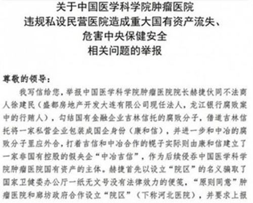 近期,有一封涉及到河北中國醫(yī)學(xué)科學(xué)院腫瘤醫(yī)院院長赫捷舉報(bào)信從業(yè)內(nèi)流出。根據(jù)舉報(bào)信稱赫捷違規(guī)私設(shè)了民營醫(yī)院,使得國有資產(chǎn)流失12億,涉及的是有關(guān)河北分院相關(guān)的一些事宜。被舉報(bào)之后,河北分院已光速注銷,記者向中國醫(yī)學(xué)科學(xué)院腫瘤醫(yī)院這一項(xiàng)目的合作方中冶集團(tuán)和河北衛(wèi)健委都分別致電,均屬于電話無人接聽的狀態(tài)。