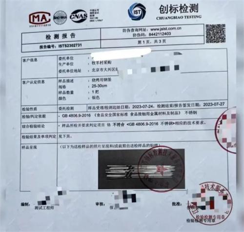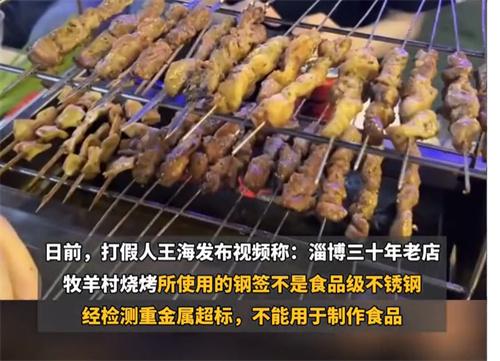 打假人王海在社交平臺上發布的一則視頻,稱淄博30年老店牧羊村燒烤使用的鋼簽并不是食品級的不銹鋼,在檢測后發現重金屬超標,不能夠用于食品方面的制作。
