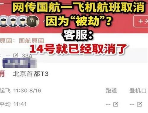 這則消息的傳播讓人們十分的擔(dān)憂和關(guān)注,飛機(jī)被劫持是極為嚴(yán)重的情況,涉及到機(jī)組人員乘客人身的安全,國航客服及時(shí)作出回應(yīng)并且對(duì)謠言澄清。根據(jù)客服的說法,在14號(hào)時(shí)這架航班已經(jīng)取消,這意味著航班并沒有執(zhí)行,飛行也不就不存在有劫持情況的出現(xiàn)。