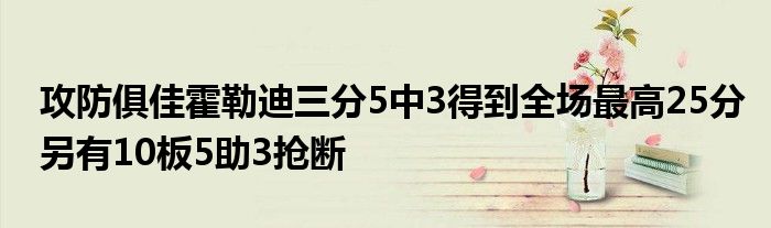 雄鹿球星霍勒迪今日在攻守兩端均打出優秀表現,他全場出戰35分36秒,投籃20中8,三分5中3,罰球6中6,得到全場最高的25分,另有10籃板5助攻3搶斷入賬,且只有2次失誤。