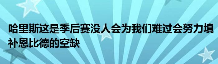 哈里斯說道:“這是季后賽,沒人會(huì)為我們感到難過或遺憾。對(duì)我們來說,恩比德受傷顯然是一個(gè)艱難的壞消息。但我們會(huì)拿出下一個(gè)人的心態(tài),我們會(huì)有人站出來,努力填補(bǔ)恩比德的空缺。”