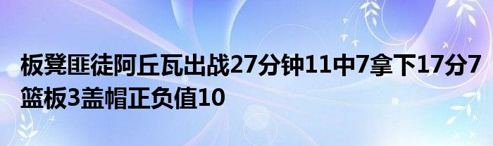 本場比賽,猛龍球員阿丘瓦替補出戰(zhàn)27分鐘,投籃11中7,三分5中1,罰球2中2,拿下17分7籃板3蓋帽,正負值+10。
