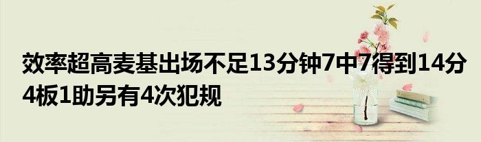 太陽中鋒麥基今日打出超高效率,替補(bǔ)出戰(zhàn)12分46秒,7次出手全部命中,得到14分4籃板1助攻,但有4次犯規(guī)。