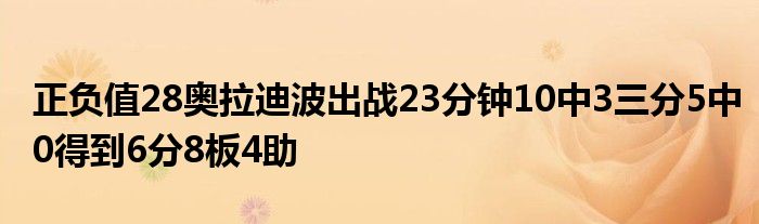 本場比賽,熱火球員奧拉迪波出戰(zhàn)23分鐘,投籃10中3,三分5中0,沒有罰球,得到6分8籃板4助攻,僅有一次失誤,正負(fù)值+28全場第二高,僅次于斯特魯斯。