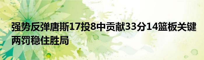 此役,森林狼中鋒唐斯強(qiáng)勢反彈,他出戰(zhàn)42分鐘25秒,投籃17中8,三分5中3,罰球17中14,貢獻(xiàn)33分14籃板3助攻1蓋帽。