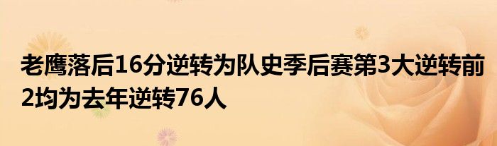 本場比賽,老鷹最多時曾落后16分,卻最終逆轉獲勝,創下了隊史季后賽第三大逆轉分差,前二均為去年東部半決賽對陣76人時所創下。