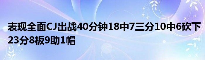 本場比賽,鵜鶘球星CJ出戰(zhàn)40分鐘,投籃18中7,三分10中6,罰球4中2,砍下了23分8籃板9助攻1蓋帽,出現(xiàn)3次失誤,正負值+11。