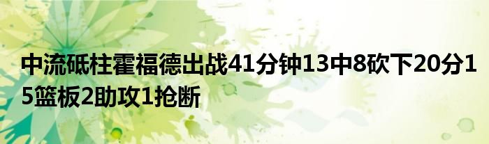 本場比賽,凱爾特人中鋒霍福德出戰41分鐘,投籃13中8,三分2中2,罰球2中2,砍下20分15籃板2助攻1搶斷,出現1次失誤,正負值+8。