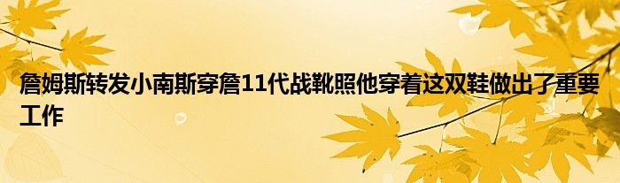 湖人球星詹姆斯轉發了小南斯今日腳穿詹姆斯11代戰靴的照片并配文道:“而且他現在還穿著它們做出了重要的工作!”