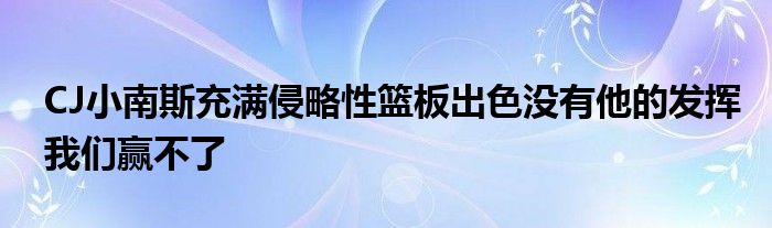 談到隊友小南斯的表現,CJ說道:“他表現很棒,第一個暫停的時候,我跟他說如果我今晚沒有發揮好的話,你要挺身而出。他充滿侵略性,籃板搶得很好。你要理解他受傷后復出沒打多久,他沒有時間訓練,而且來到了新的城市,我們都離家人很遠。很多因素會讓我們適應變得困難,但他找到了自己舒服的位置,作用不可小覷。沒有他的發揮,我們今晚贏不了。”