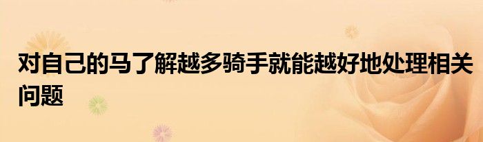 騎手和教練對馬的認識越深入——不僅是身體部分而且包括心理部分——就能更好地制定出長期、短期的訓練計劃,在比賽場上也就更容易取得成功。騎手需要對自己的馬全方面負責,這項責任不是輕易就能履行的。成為馬的忠實搭檔、盡可能地為它創造最好的條件,這些付出都能得到豐碩的回報。