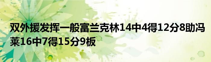 此役上海雙外援發(fā)揮一般,其中富蘭克林出場24分鐘,全場14投4中,三分6中2,罰球2中2,得到12分6籃板8助攻1搶斷,正負(fù)值+15。
