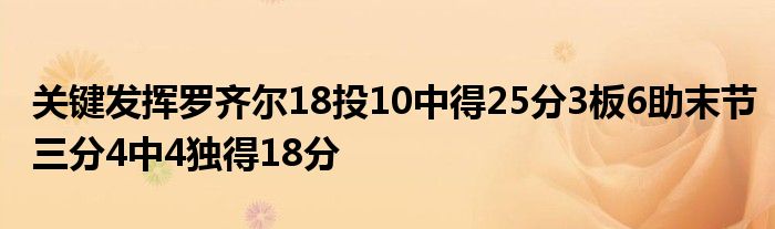 本場比賽,羅齊爾可謂是黃蜂隊的取勝功臣,全場他出戰32分鐘,18投10中,罰球9中5得到了25分3板6助,他的正負值為+6。在末節比拼中,他7投7中獨得18分。