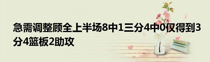 上半場比賽當中,顧全出戰(zhàn)18分20秒,投籃8投僅1中,三分4投全失,罰球2罰1中,僅得到3分4籃板2助攻,正負值+5。