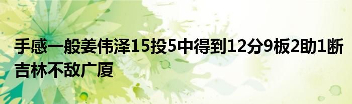 本場比賽,吉林小將姜偉澤手感一般,出戰41分鐘,投籃15中5,其中三分球7中2,得到12分9籃板2助攻1搶斷,另有3次失誤。