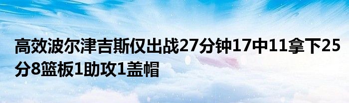 本場比賽,奇才球員波爾津吉斯只打了三節(jié),他出戰(zhàn)27分鐘,投籃17中11,三分5中3,沒有罰球,拿下25分8籃板1助攻1蓋帽,沒有失誤。
