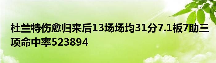數據顯示,自膝蓋傷愈復出以來,杜蘭特已出戰13場,杜蘭特場均得到31分7.1籃板7助攻,投籃命中率52%,三分命中率38%,罰球命中率94%。