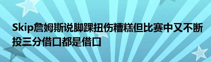 Skip寫道:“來了來了又來了,詹姆斯剛剛說他扭傷腳踝很‘糟糕’...但是他又不想缺席比賽。等等!比賽中他扭傷腳踝后又立馬站起來并不斷地投三分,他看起來有一瘸一拐嗎?不,似乎他是在保護、呵護自己的腳踝。借口,都是借口。”