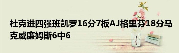 此役,杜克大學陣中,熱門秀班凱羅11投4中,三分2中1、罰球8中7,拿到16分7籃板3助攻1搶斷1蓋帽;另外一位熱門秀AJ-格里芬9投7中,三分3中2、罰球2中2,得到18分3籃板1搶斷1蓋帽;馬克-威廉姆斯6投全中貢獻12分12籃板3蓋帽;小溫德爾-摩爾得到14分2籃板2助攻2搶斷。