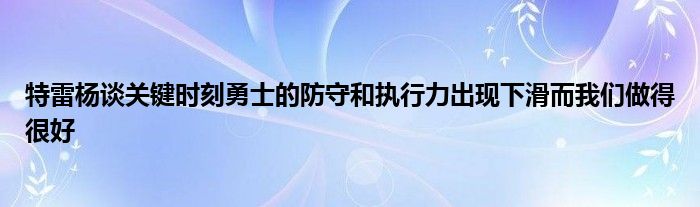談到在比賽還剩3分45秒時,勇士將分差追至三分,楊講道:“我們知道這時需要去防守,勇士打出了攻擊波,命中了一些有難度和爭議的三分球。在比賽的最后階段,他們的防守和執行力出現了下滑,而我們在這方面做得很好,盡管克萊命中有難度的投籃,但我們能做好一些防守也很棒。”