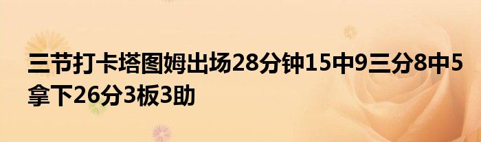 本場比賽,凱爾特人球星塔圖姆發(fā)揮出色,他出場28分鐘,三節(jié)打卡,投籃15中9,三分8中5,罰球3中3,拿下26分3籃板3助攻1蓋帽,出現(xiàn)2次失誤,正負(fù)值+16。