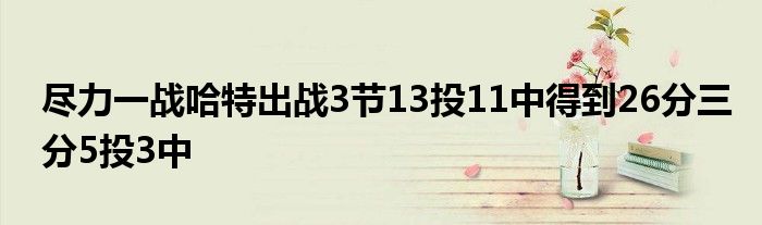 本場比賽,開拓者球員哈特表現不錯,他全場比賽出戰30分鐘,13投11中,其中三分球5投3中,罰球1投1中,得到26分3籃板4助攻2搶斷的全面數據,但由于球隊分差太大,他第四節比賽沒有出戰。