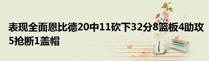 本場比賽,76人中鋒恩比德發(fā)揮出色,他出場34分鐘,投籃20中11,三分6中2,罰球9中8,砍下32分8籃板4助攻5搶斷1蓋帽,不過出現(xiàn)了6次失誤。