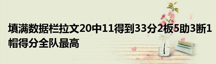 本場比賽,公牛隊球員拉文出戰33分鐘,20投11中,三分10中5、罰球8中6,得到全隊最高的33分,還有2籃板5助攻3搶斷1蓋帽的數據,同時還有1次失誤和3個犯規,正負值-1。