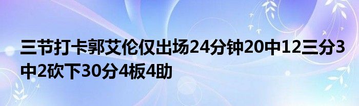 本場比賽,遼寧后衛(wèi)郭艾倫發(fā)揮高效,他出場24分鐘,三節(jié)打卡,投籃20中12,三分3中2,罰球5中4,砍下30分4籃板4助攻1搶斷。