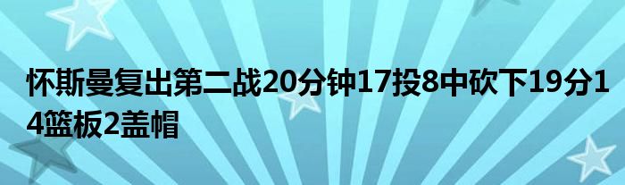 本場比賽,懷斯曼迎來發展聯盟復出的第二戰,他最終出戰20分22秒,17投8中,三分2中1,罰球4中1,砍下19分14籃板2蓋帽,也出現了5個失誤3個犯規,正負值+4。