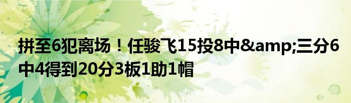 本場比賽,廣東隊球員任駿飛有著不錯的發揮,他出戰32分47秒,15投8中,三分6中4,得到并列全隊最高的20分,還有3籃板1助攻1蓋帽的數據。在比賽末節,任駿飛拼至6犯離場。