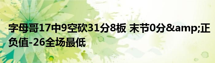 本場,字母哥出戰34分鐘,投籃17中9,三分4中1,罰球18中12,砍下31分8籃板3助攻1蓋帽,正負值-26全場最低。