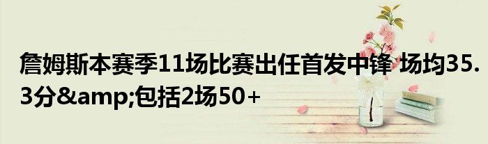 據統計,本賽季有11場比賽,詹姆斯以中鋒的角色首發出戰,場均可以得到35.3分,投籃命中率55%,三分命中率40%,其中包括兩場50+的比賽。