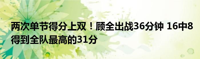 全場比賽,顧全出戰35分52秒,投籃16中8,三分12中5,罰球10罰全中,得到全隊最高的31分外加6籃板5助攻。
