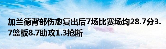 在這7場比賽中,加蘭德場均得到28.7分3.7籃板8.7助攻1.3搶斷,投籃命中率54.2%,三分命中率47.1%,罰球命中率92%,真實(shí)命中率65.7%。