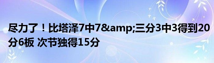 全場比賽,比塔澤替補出戰23分34秒,投籃7中7,三分3中3,罰球3中3,得到20分6籃板,正負值+13。
