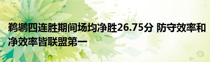 鵜鶘在全明星間歇期過后4勝0負,場均凈勝對手26.75分,期間凈效率值聯盟第一、防守效率聯盟第一、進攻效率聯盟第二。