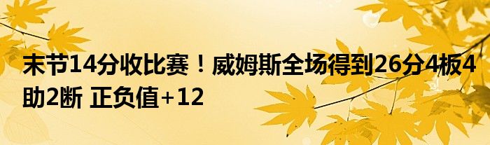 末節威姆斯出戰9分鐘,投籃8中6,三分2中1,罰球1中1,單節得到14分3籃板1搶斷,幫助廣東隊拿下比賽。