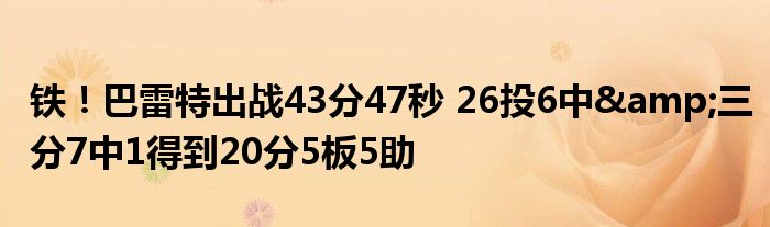 本場比賽,尼克斯球員巴雷特手感不佳,他出戰43分47秒,26投6中,三分7中1、罰球10中7,得到20分5籃板5助攻,同時還有3次失誤。