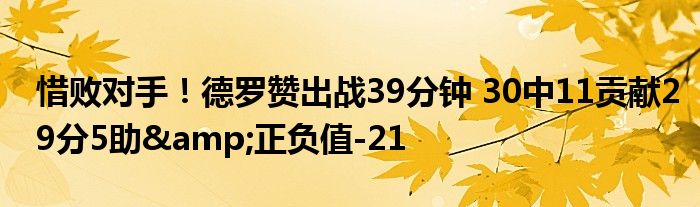 全場比賽,德羅贊出戰39分26秒,投籃30中11,三分3中2,罰球5中5,得到29分3籃板5助攻,正負值-21。