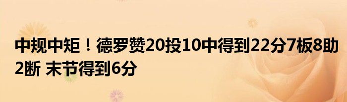 公牛球星德羅贊本場比賽出戰38分39秒,20投10中,三分1中0,罰球2中2,得到了22分7籃板8助攻2搶斷的數據,正負值為-8。