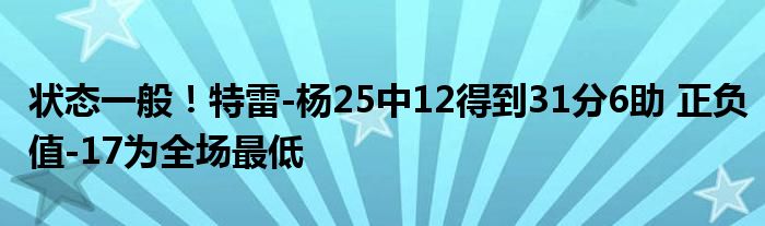 老鷹球星特雷-楊本場(chǎng)比賽狀態(tài)一般,他全場(chǎng)比賽出戰(zhàn)37分鐘,25投12中,三分7中2,罰球6中5,得到了31分2籃板6助攻的數(shù)據(jù),正負(fù)值-17為全場(chǎng)最低。