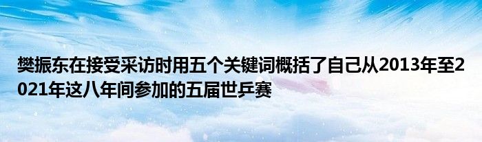 日前,樊振東在接受采訪時用五個關(guān)鍵詞概括了自己從2013年至2021年這八年間參加的五屆世乒賽,從2013年初次參加世乒賽的懵懂,到2015年期待自己“能往前打一打”,再到2017年單打如果再堅定一點可能能得到冠軍,以及2019年困擾自己的“包袱”,最后來到2021年因“簡單”而奪取的勝利,他分別用懵懂、躊躇滿志、遺憾與不甘、糾結(jié)以及簡單來形容這五次世乒賽。