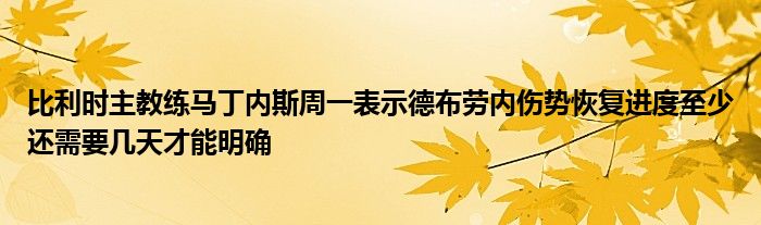 比利時主教練馬丁內斯周一表示,德布勞內傷勢恢復進度至少還需要幾天才能明確,目前還不知道他能否參加本屆歐洲杯。德布勞內在上周六歐冠決賽中鼻梁和左眼窩骨折,而比利時的歐洲杯首戰是6月12日對陣俄羅斯。德布勞內原本計劃在歐冠決賽后進行短暫休假,再返回隊。馬丁內斯說:“他的日程和其他球員不同,他7天后才會加入我們,因為他踢了歐冠決賽,但是這個計劃顯然已經改變了,現在他還不能放松和休息。”