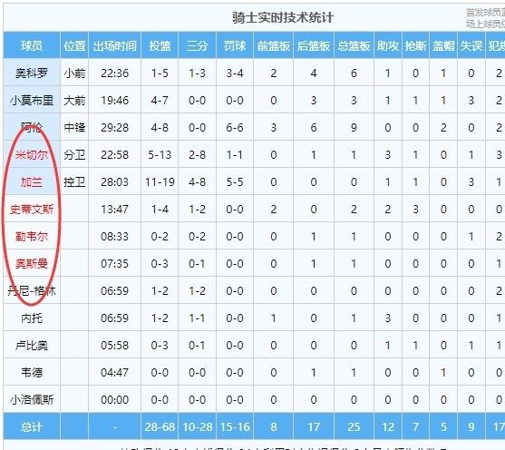 騎士:加蘭33分兩次助攻兩斷;阿倫14分9個籃板兩個蓋帽,米切爾19分三次助攻,奧克羅6分6個籃板,莫布里13分4個籃板兩次助攻,史蒂文斯7分5個籃板4次助攻兩斷,奧斯曼得10分5個籃板,內托7分4次助攻。