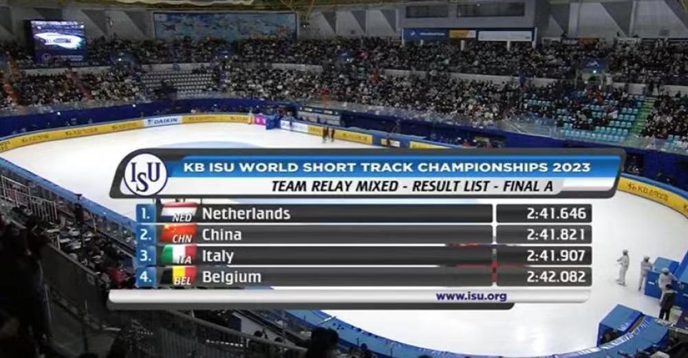 3月12日2023年短道速滑世錦賽最后一個比賽項目,男子5000米接力決賽正式開始,中國的參賽隊員分別為李文龍、林孝埈、劉冠毅、鐘宇晨,中國隊在比賽中表現得很出色,最終以7分04秒412的成績獲得第1名拿到世錦賽冠軍,這是本屆世錦賽中國隊拿到的第1枚金牌。男女混合接力2000米比賽,布陣的隊員分別為公俐、李文龍、林孝埈和臧一澤完成,獲得亞軍,拿到銀牌。