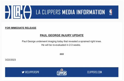 3月23日,快船官方宣布,在接受核磁共振檢查之后,確診喬治右膝扭傷,至少缺席2~3周比賽。目前快船還剩下九場常規賽,按照喬治的復查行程看,預計剩下的常規賽可能報銷。在確定無緣接下來的比賽之時,喬治在個人媒體發聲,感謝你們所有人。