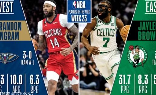 NBA官方公布第23周周最佳球員:布朗和英格拉姆榮膺東西部周最佳