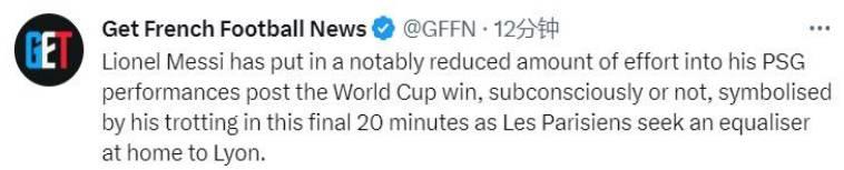 在本次比賽數據統計中,梅西有一角射正,其中5次威脅性傳球和4次帶球過人,在后評分的過程中打分8.01和里昂的門將洛佩茲分數并列達到全場最高。但是在賽后,法國媒體對于梅西在場上的表現作出了批評,表示自從卡塔爾世界杯,大巴黎拿到了世界杯冠軍之后,梅西在大巴黎的表現和之前相比,明顯沒有出力,而今日在和李昂比賽最后的20分鐘,在場上不斷慢跑,而其他的球員正在為班平里昂的比分不斷的努力。